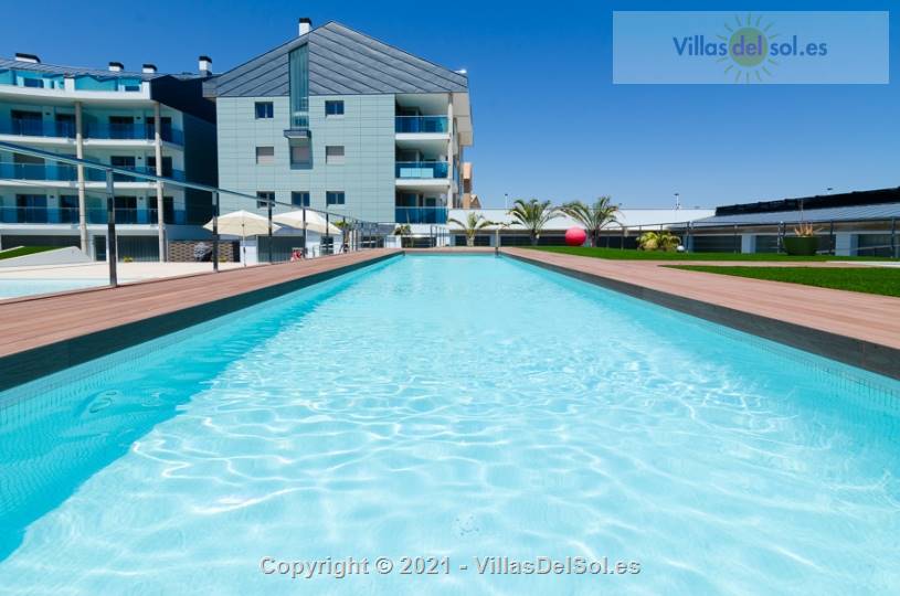 Salida del salón a la terraza con mobiliario de relax, vista al mar y piscina desde la terraza.